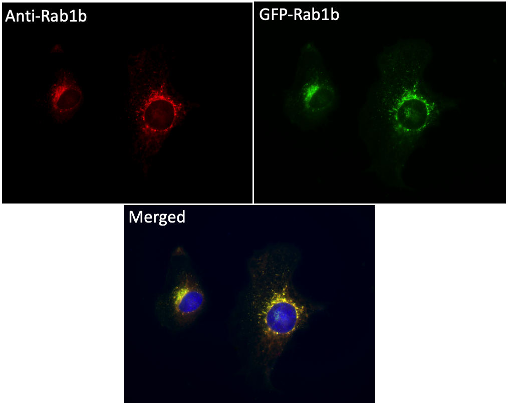 Goat polyclonal antibody to Rab1b. Rab1b belongs to the small GTPase superfamily, Rab family. Rab1b together with Rab1a control vesicle traffic from the endoplasmic reticulum to the Golgi apparatus.