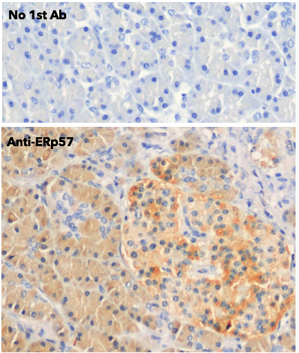 IHC of human pancreas using anti-Rab1b antibody and FFPE tissue after heat-induced antigen retrieval; Anti-Rab1b Ab at 1:750/DAB detection;