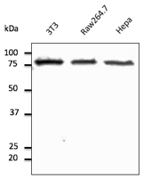 Detects a band of 90 kDa by Western blot in the following human (293A, primary fibroblasts, HaCat, HeLa, HMEC-1, Jurkat, MNT1, U-118, rat (TR-iBRB), mouse (3T3, AtT-20, Hepa, Raw264.7), monkey (COS-7) and canine (D17) whole cell lysates.