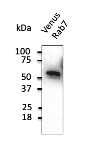 Anti-Venus Ab at 1/2,000 dilution; 293HEK cells transduced with Venus-Rab7 Ad; lysates at 50 µg per lane; rabbit polyclonal to goat IgG (HRP) at 1/10,000 dilution;