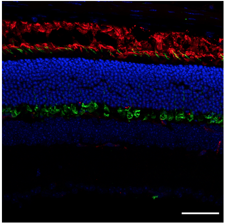 Green- 1st Ab Cone Arrestin (1/1,000); 2nd Ab goat anti-rat (AB28488, 1/1,000), Red- 1st Ab Rhodopsin (1/1,000); 2nd Ab goat anti-mouse (AB27550, 1/1,000), Blue- Nuclear staining (DAPI), scale bar = 40 um;