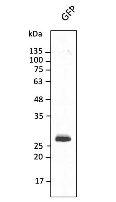 Anti-GFP Ab conjugated to DyLight® 680 at 1/2,000 dilution using HEK293 transfected cell lysates at 30 µg per lane;