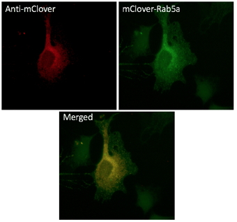 Immunofluorescence – anti-mClover Ab using NIH3T3 cells transduced with mClover-Rab5a; cells were fixed with methanol and anti-mClover at 1/250;