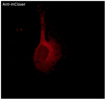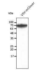 Anti-mClover Ab at 1/2,500 dilution using HEK293 transfected cell lysates at 50 µg per lane; rabbit polyclonal to goat IgG (HRP) at 1/10,000 dilution;