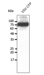 Anti-CFP Ab at 1/2,500 dilution using HEK293 transfected cell lysates at 50 µg per lane; rabbit polyclonal to goat IgG (HRP) at 1/10,000 dilution;