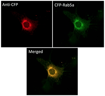 Immunofluorescence – anti-CFP Ab using NIH3T3 cells transduced with CFP-Rab5a; cells were fixed with methanol and anti-CFP at 1/250;